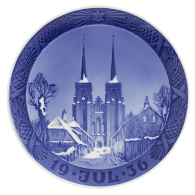 Il piatto di Natale del 1936 è il 29° della serie di famosi piatti Royal Copenhagen ed è intitolato “Roskilde Cathedral”. Il motivo riprodotto è in rilievo e il piatto è decorato a mano nelle classiche sfumature blu cobalto applicate sottosmalto.