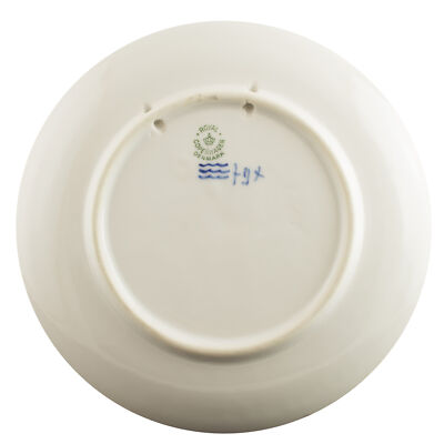 A garanzia di autenticità il piatto reca il marchio della Royal Copenhagen, la Corona sopra le tre Linee Ondulate e le iniziali del pittore.