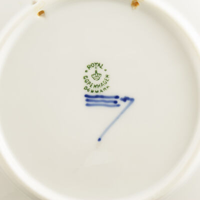 A garanzia di autenticità il piatto reca il marchio della Royal Copenhagen, la Corona sopra le tre Linee Ondulate e le iniziali del pittore.