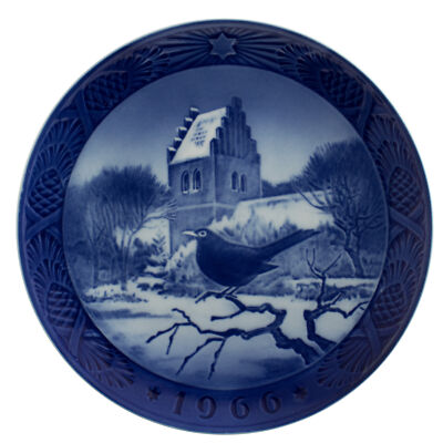 Il piatto di Natale del 1966 è il 59° della serie di famosi piatti Royal Copenhagen ed è intitolato “Blackbird at Christmastime”. Il motivo riprodotto è in rilievo e il piatto è decorato a mano nelle classiche sfumature blu cobalto applicate sottosmalto.