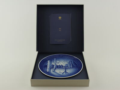Il piatto di Natale del 2021 è il 114° della serie di famosi piatti Royal Copenhagen ed è intitolato “Inverno in Giardino”. Il motivo riprodotto è in rilievo e il piatto è decorato a mano nelle classiche sfumature blu cobalto applicate sottosmalto. Il disegno è opera di Allan Therkelsen.