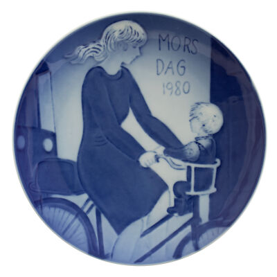 Il piatto della Festa della Mamma del 1980 è il 10° della serie di famosi piatti Royal Copenhagen della Mamma ed è intitolato “Mamma con Bambino in Bicicletta”. Il motivo riprodotto è in rilievo e il piatto è decorato a mano nelle classiche sfumature blu cobalto applicate sottosmalto.