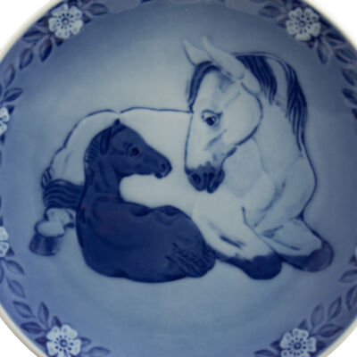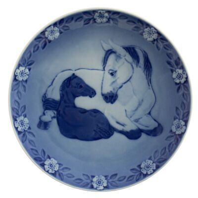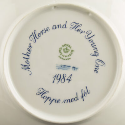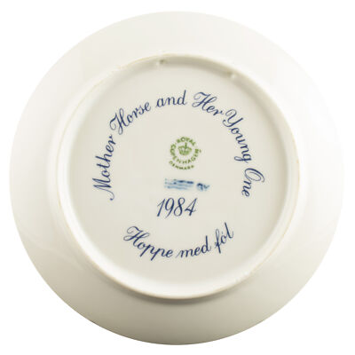 Il piatto della Festa della Mamma del 1984 è il 15° della serie di famosi piatti Royal Copenhagen della Mamma ed è intitolato "Mamma Cavallo e il suo Puledro”. Il motivo riprodotto è in rilievo e il piatto è decorato a mano nelle classiche sfumature blu cobalto applicate sottosmalto.