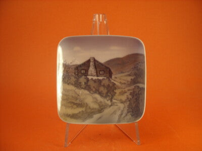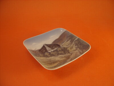 Posacenere / Svuotatasche / Piattino in porcellana della Royal Copenhagen raffigurante una casetta in montagna. Il motivo riprodotto è in rilievo e decorato a mano con la tecnica del sottosmalto.