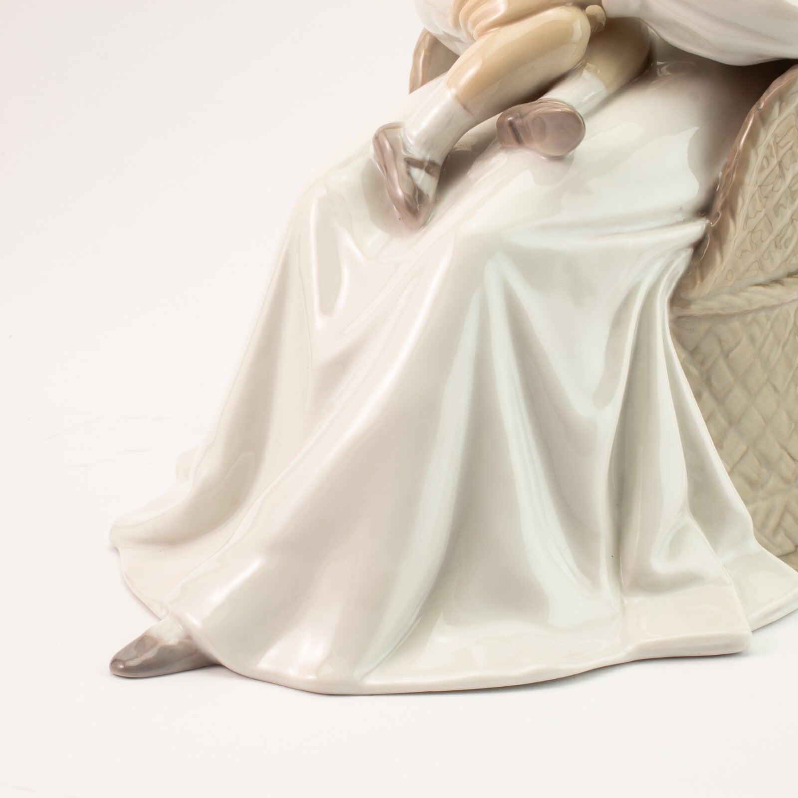 Come si vede dalle foto la statuina presenta una crepa sul vestito all'altezza della gamba destra della mamma. La crepa è dovuta ad un difetto di cottura e non a un qualche tipo di danno; quindi la statuina è perfettamente integra.
