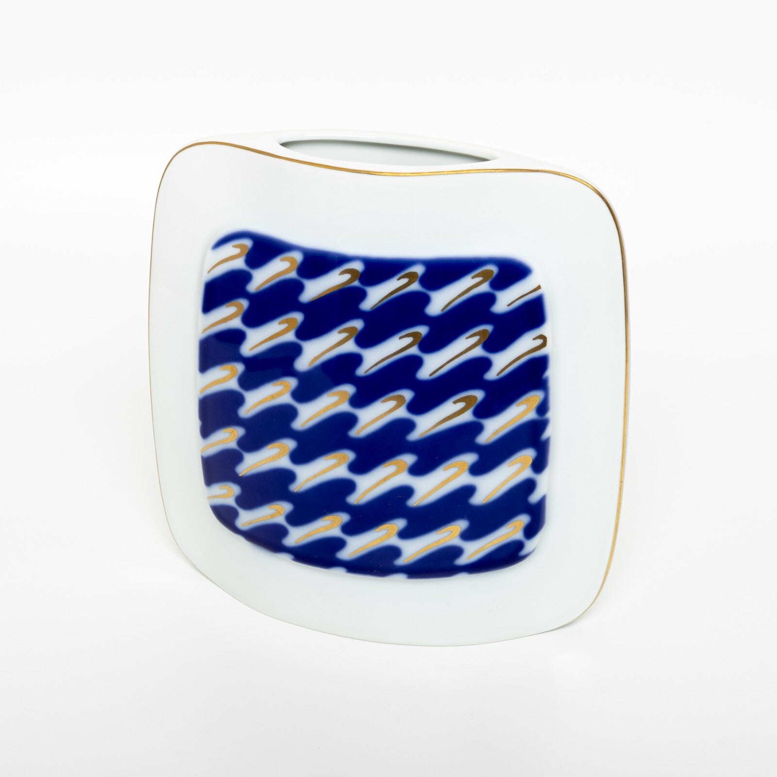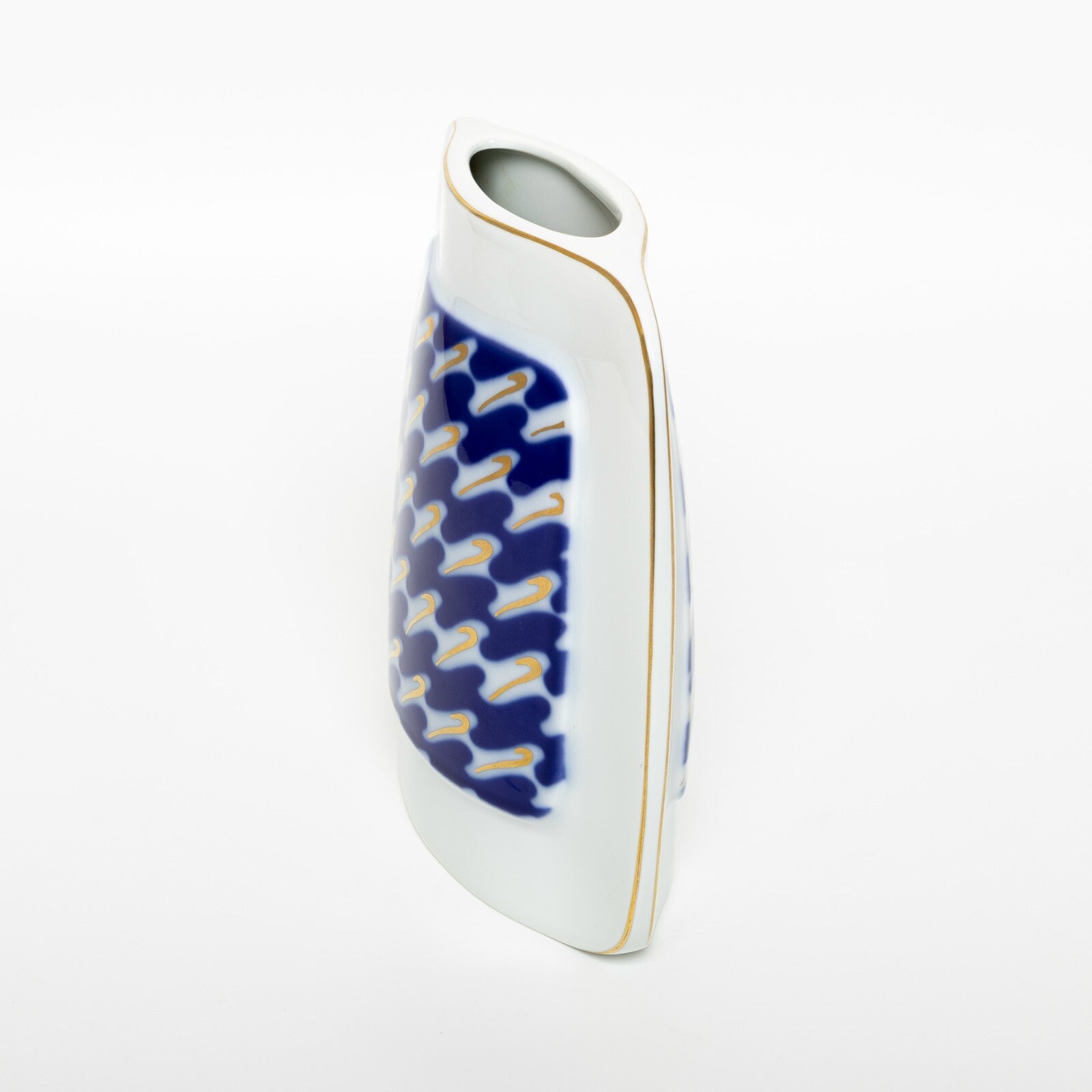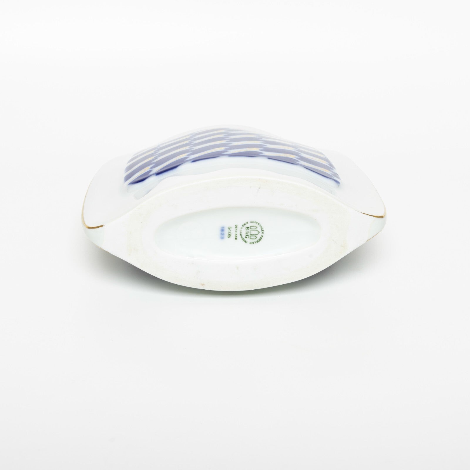 Il vaso in porcellana della Bing&Grondahl è in stile moderno, di forma ovale con decorazioni in blu e oro ed è identificato dal codice 5405.