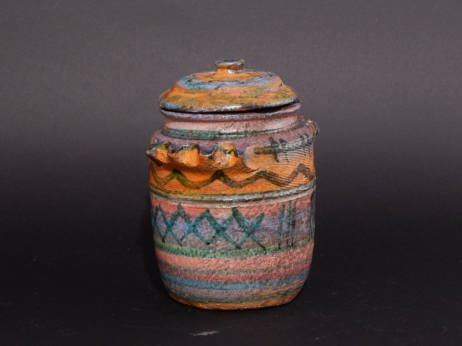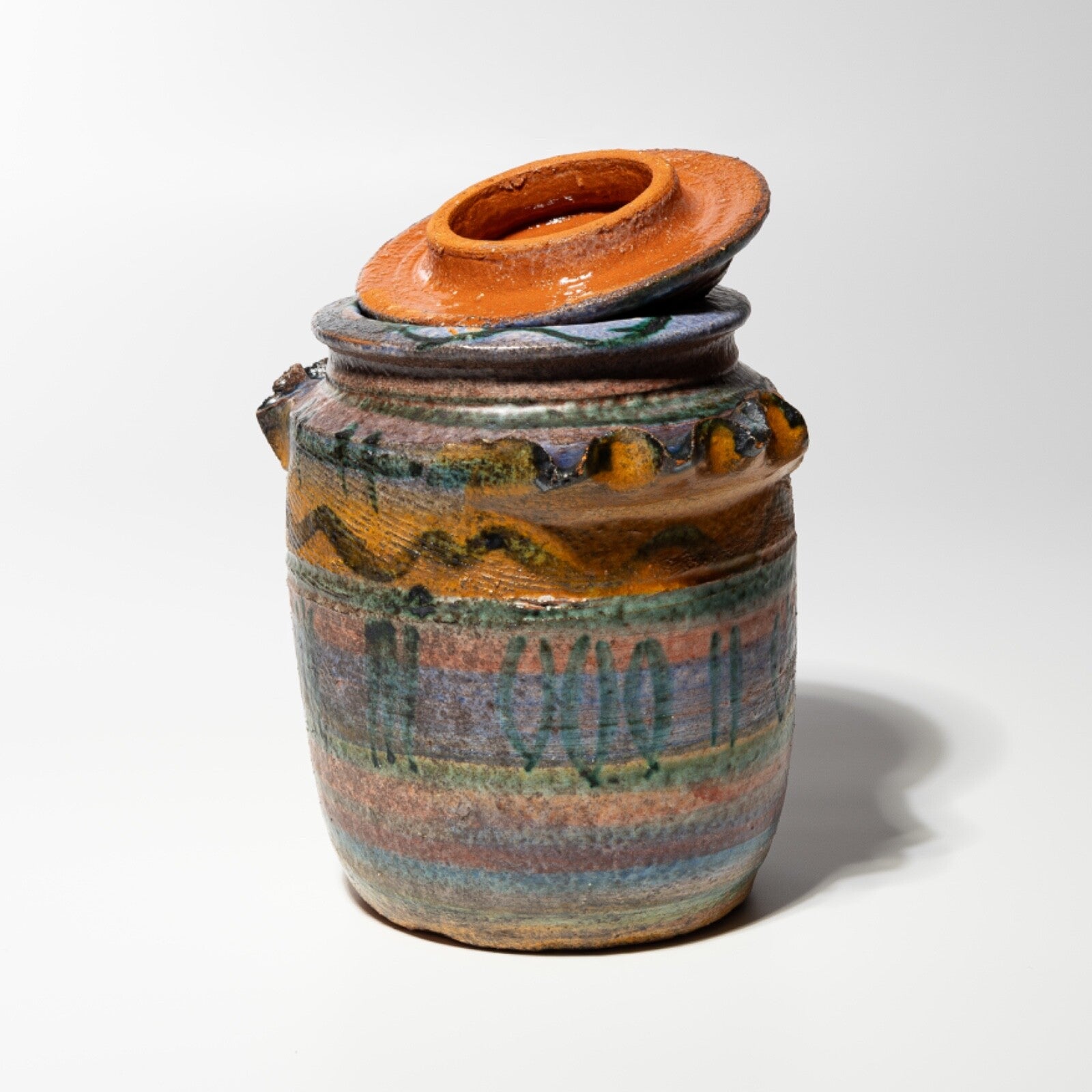 In questa inserzione viene presentato un vaso con coperchio o albarello in ceramica realizzato e decorato a mano in una bottega di Castellamonte.
