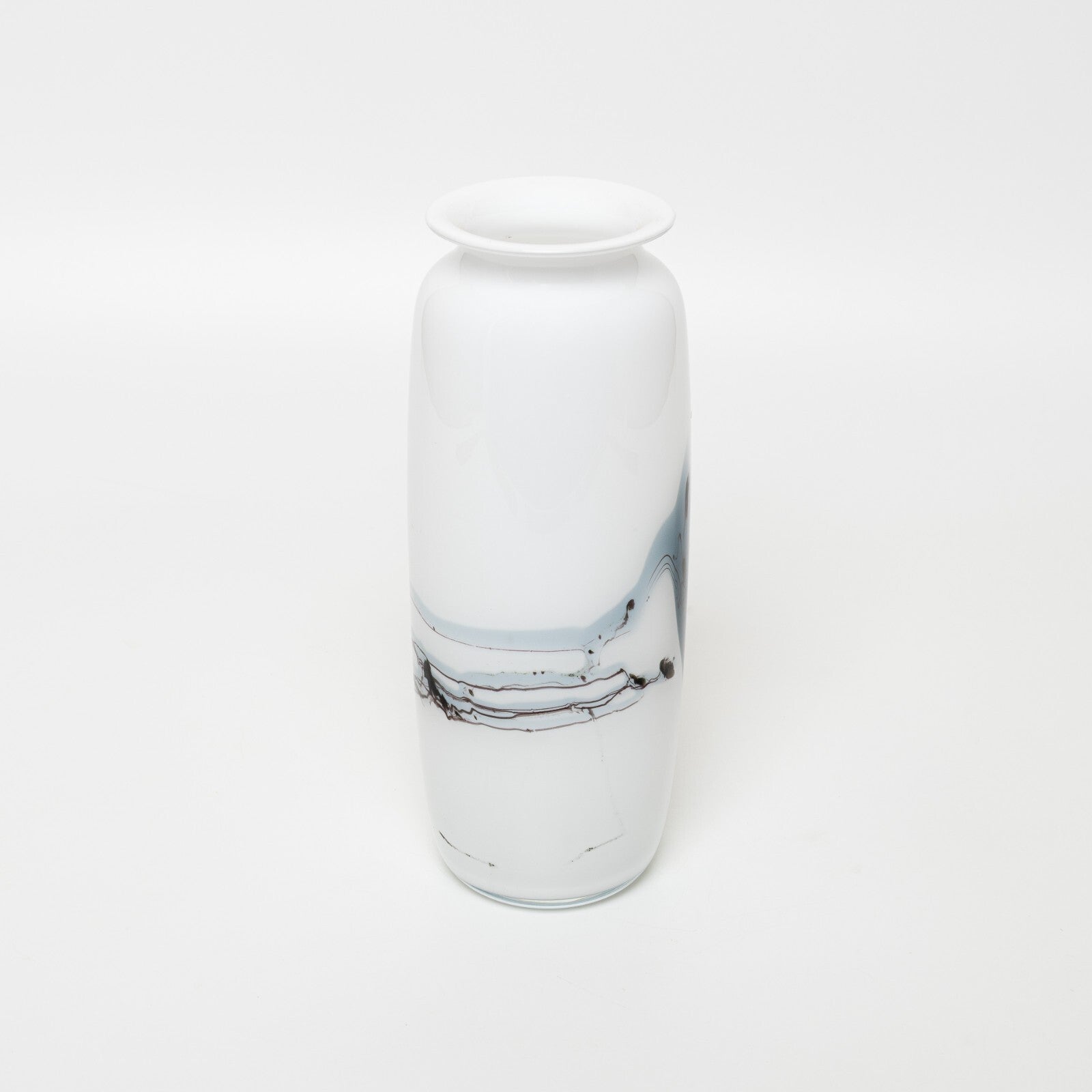 Vaso in vetro soffiato opalino bianco con decoro blu prodotto dalla Holmegard. Fa parte della collezione Atlantis del designer Michael Bang ed è stato prodotto negli anni '80.