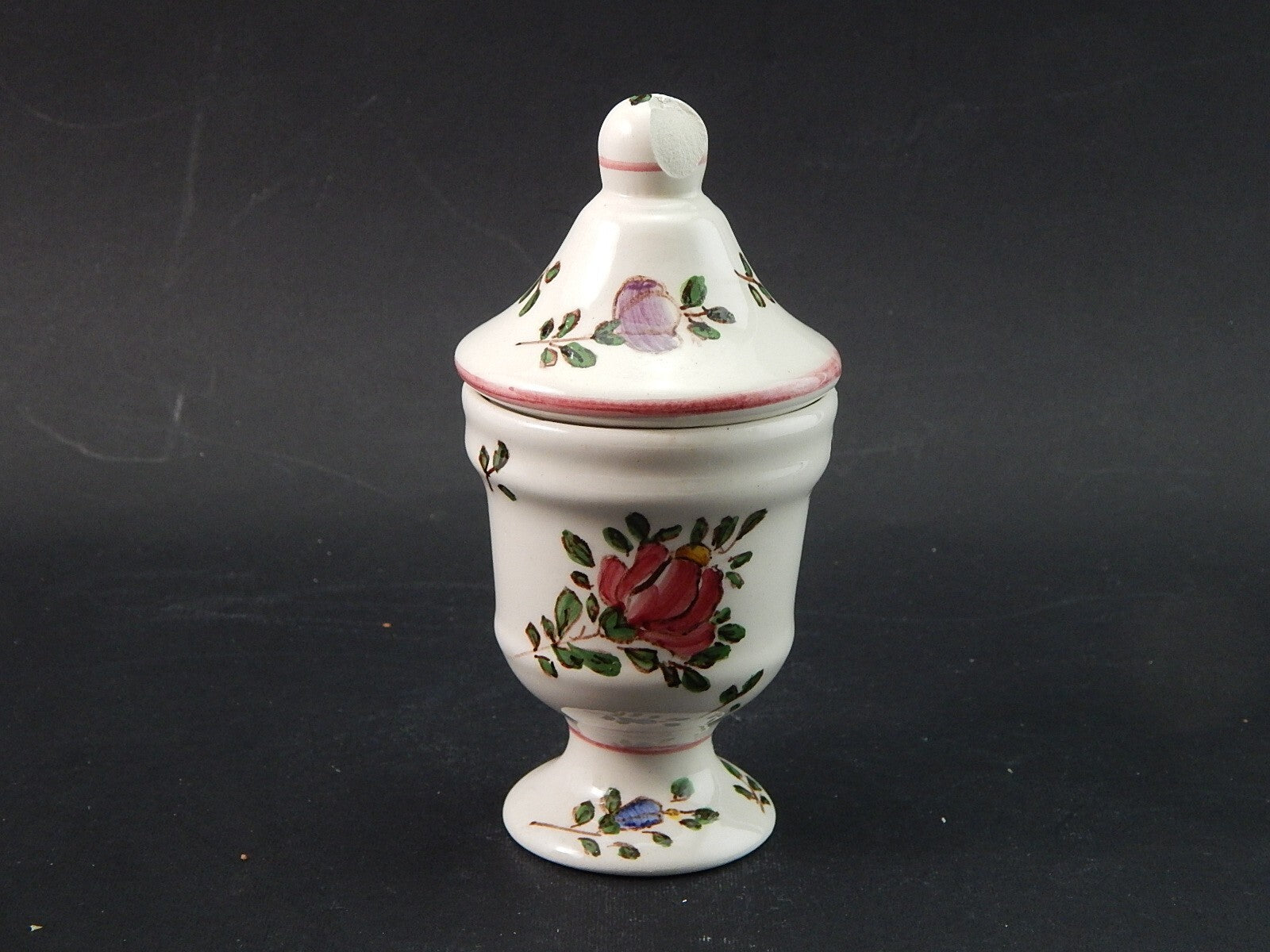 L'albarello con decoro Vecchia Lodi misura 7,5 cm di diametro e 15 cm di altezza con il coperchio, come si può vedere dalle foto presenta una scheggiatura sulla presa del coperchio.