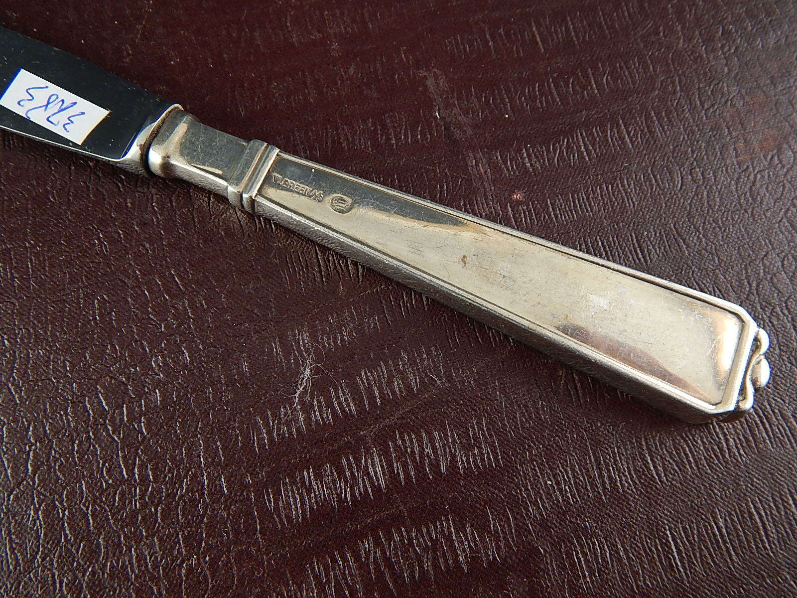 Il coltello misura 19 cm di lunghezza, reca il punzone con i tre campanili che certifica la qualità dell’argento 925 e l’anno di produzione 1956 e il punzone dell’argentiere