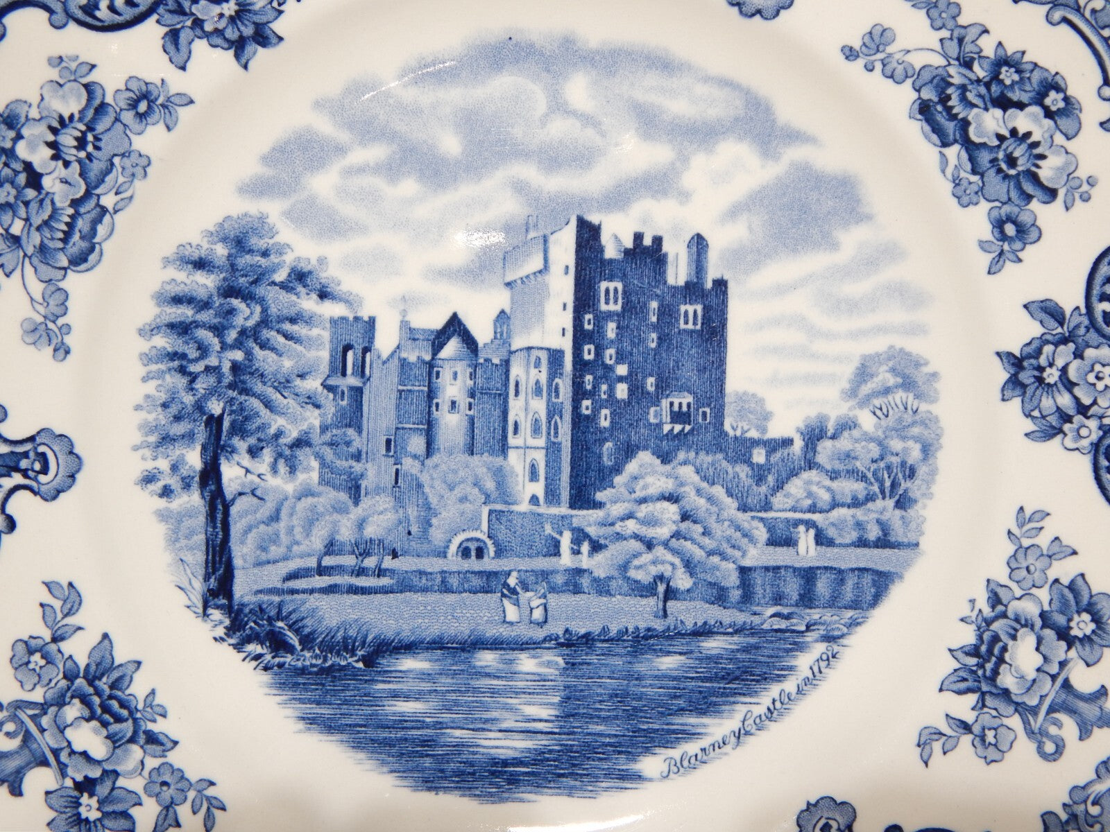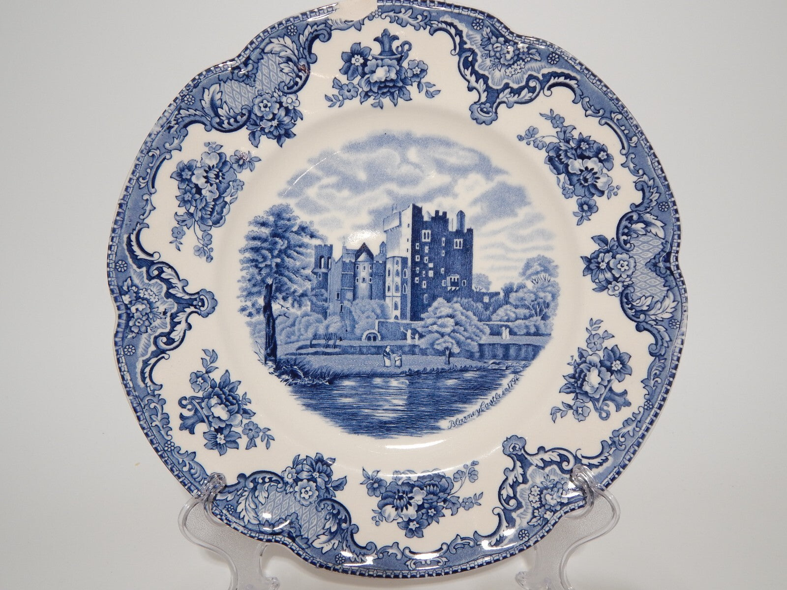 In questa inserzione viene presentato un piatto piano in semi-porcellana della collezione Old Britain Castle blu realizzato dalla manifattura inglese Johnson Bros.