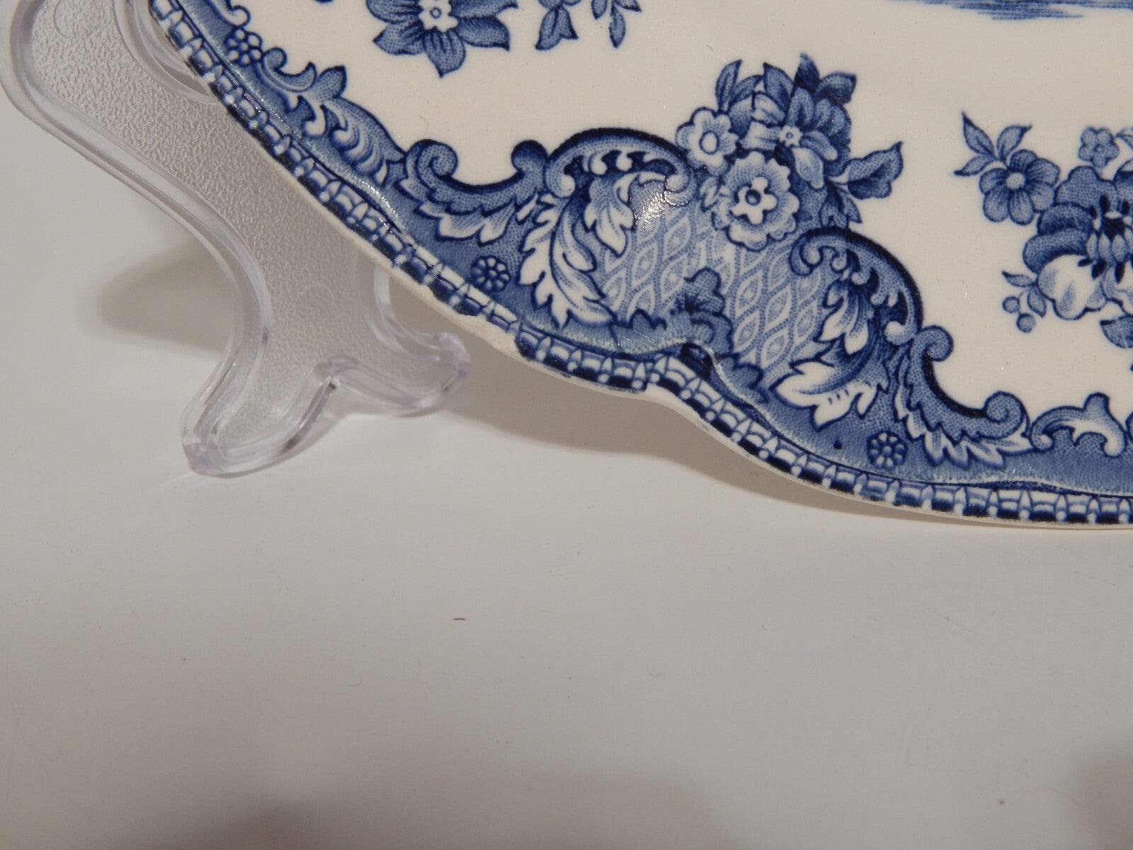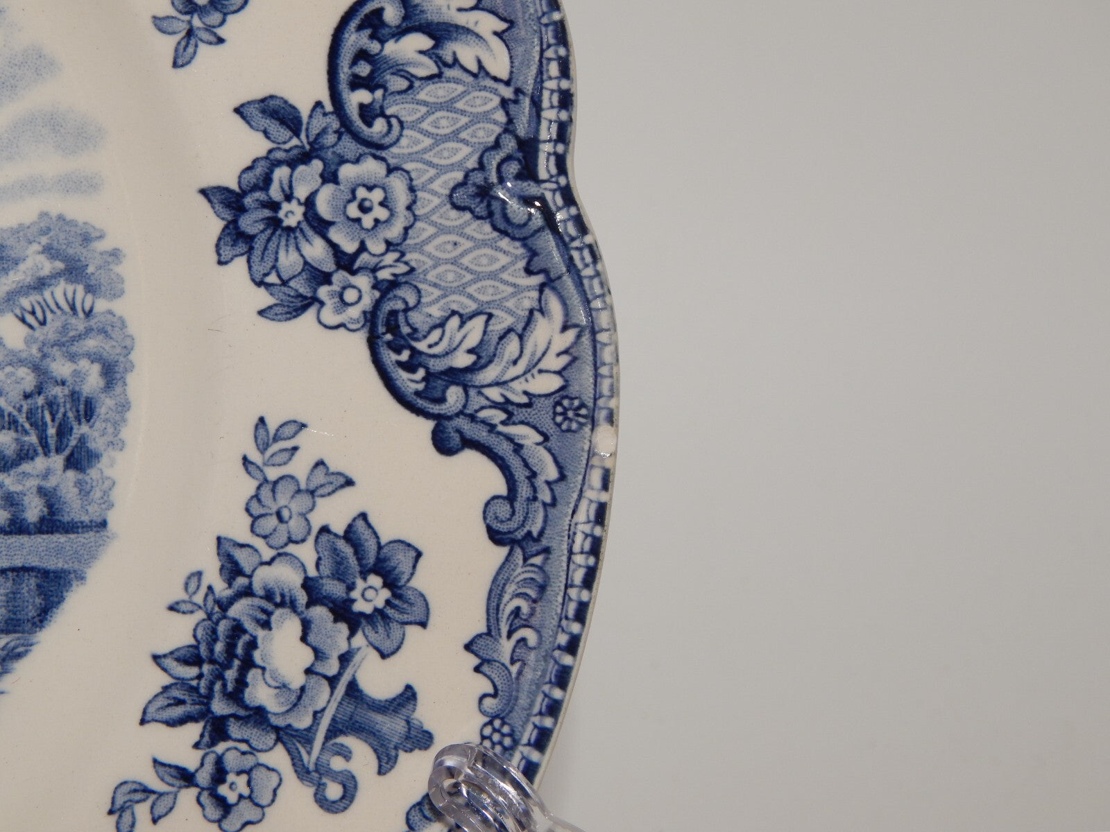 In questa inserzione viene presentato un piatto piano in semi-porcellana della collezione Old Britain Castle blu realizzato dalla manifattura inglese Johnson Bros.