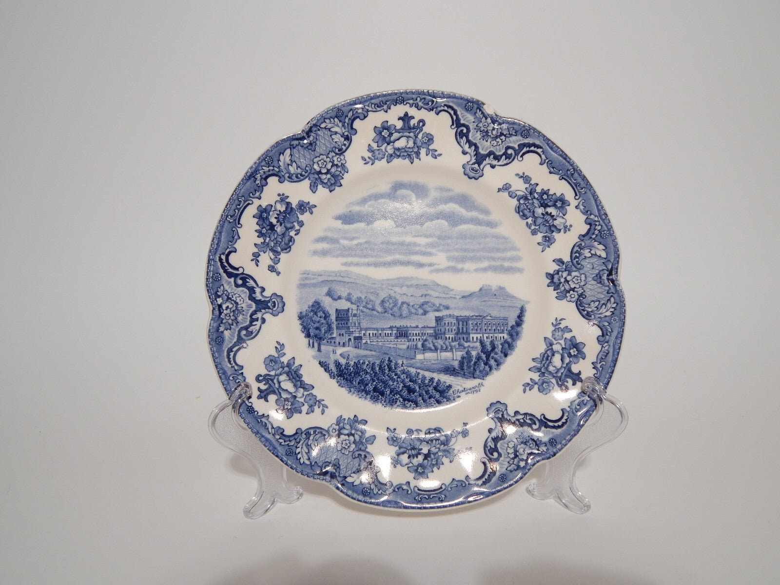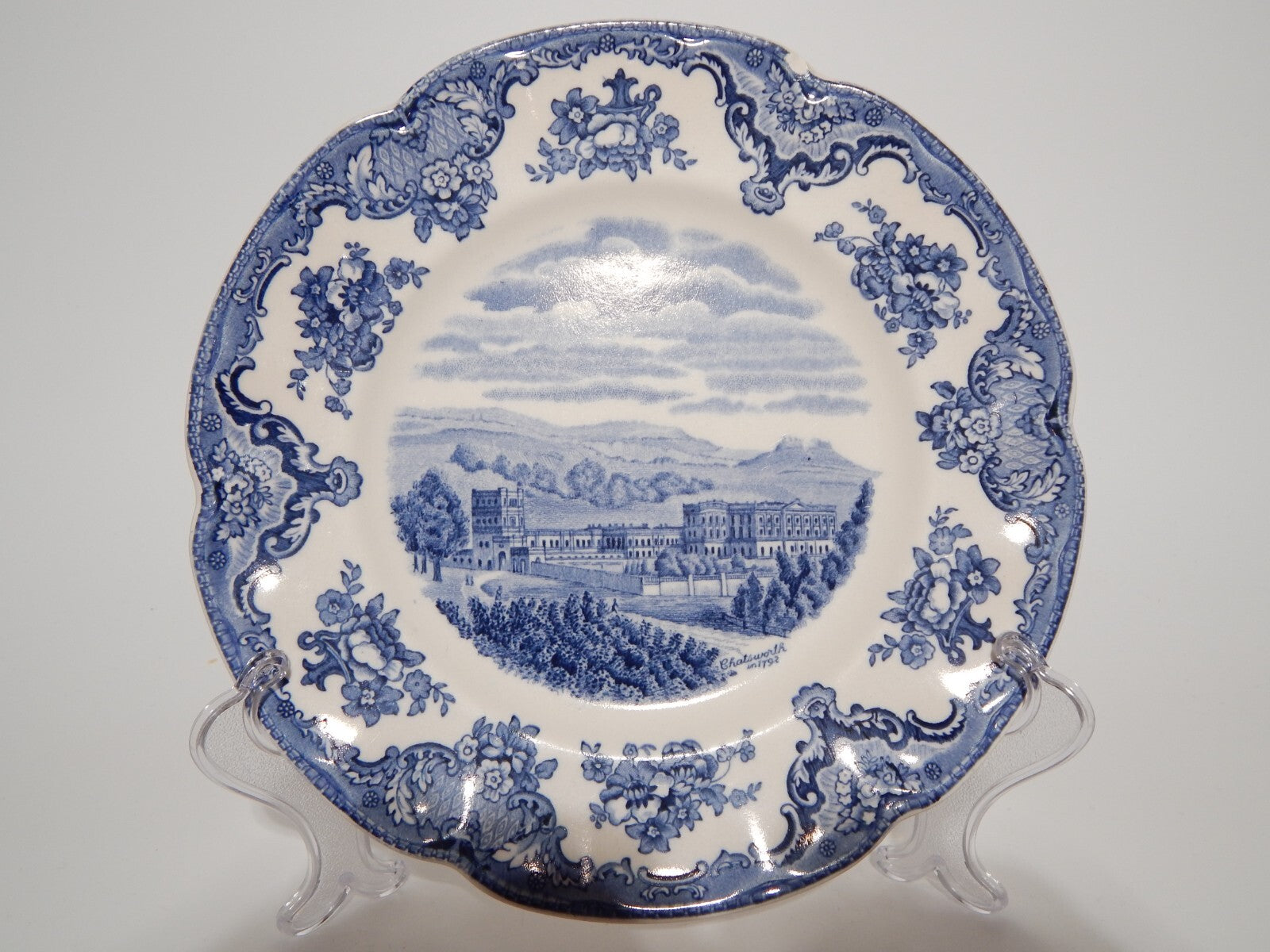 In questa inserzione viene presentato un piatto da dessert in semi-porcellana della collezione Old Britain Castle blu realizzato dalla manifattura inglese Johnson Bros.