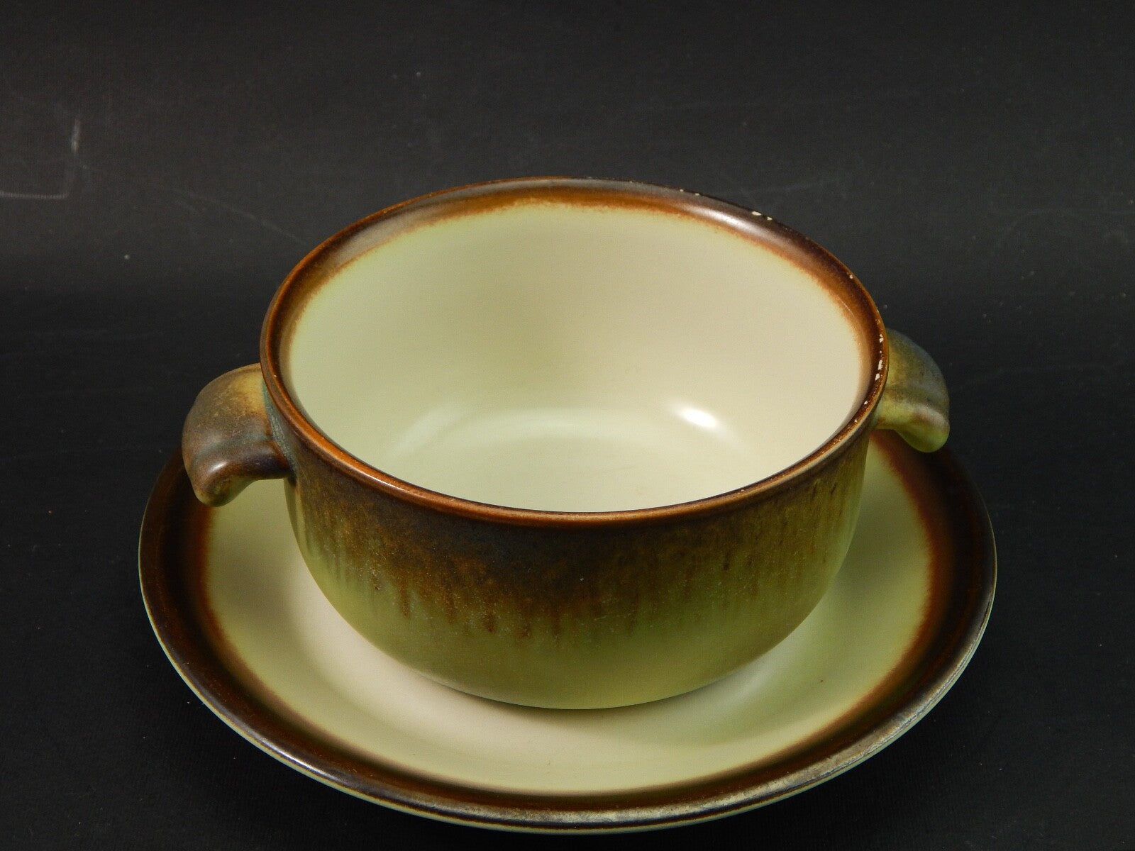 In questa inserzione viene presentata una tazza da brodo con relativo piattino vintage della collezione Tuscia realizzata dalla manifattura Porcellane Mancioli.