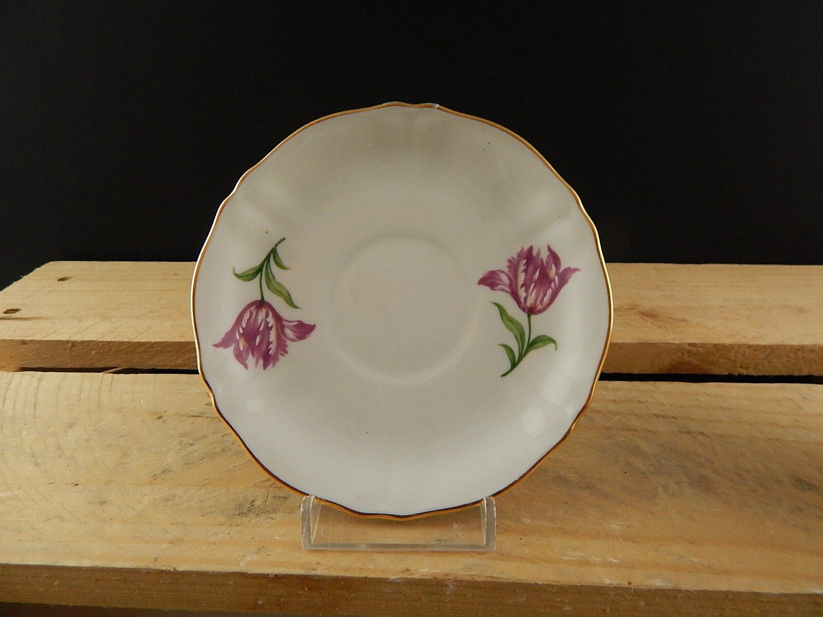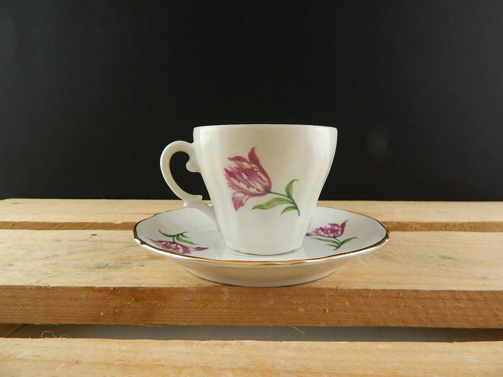 La tazza misura 6 cm. di diametro e 5,5 cm. di altezza, il piattino misura 12 cm. di diametro, buone condizioni eccetto per il profilo in oro che sulla tazzina non è più perfetto