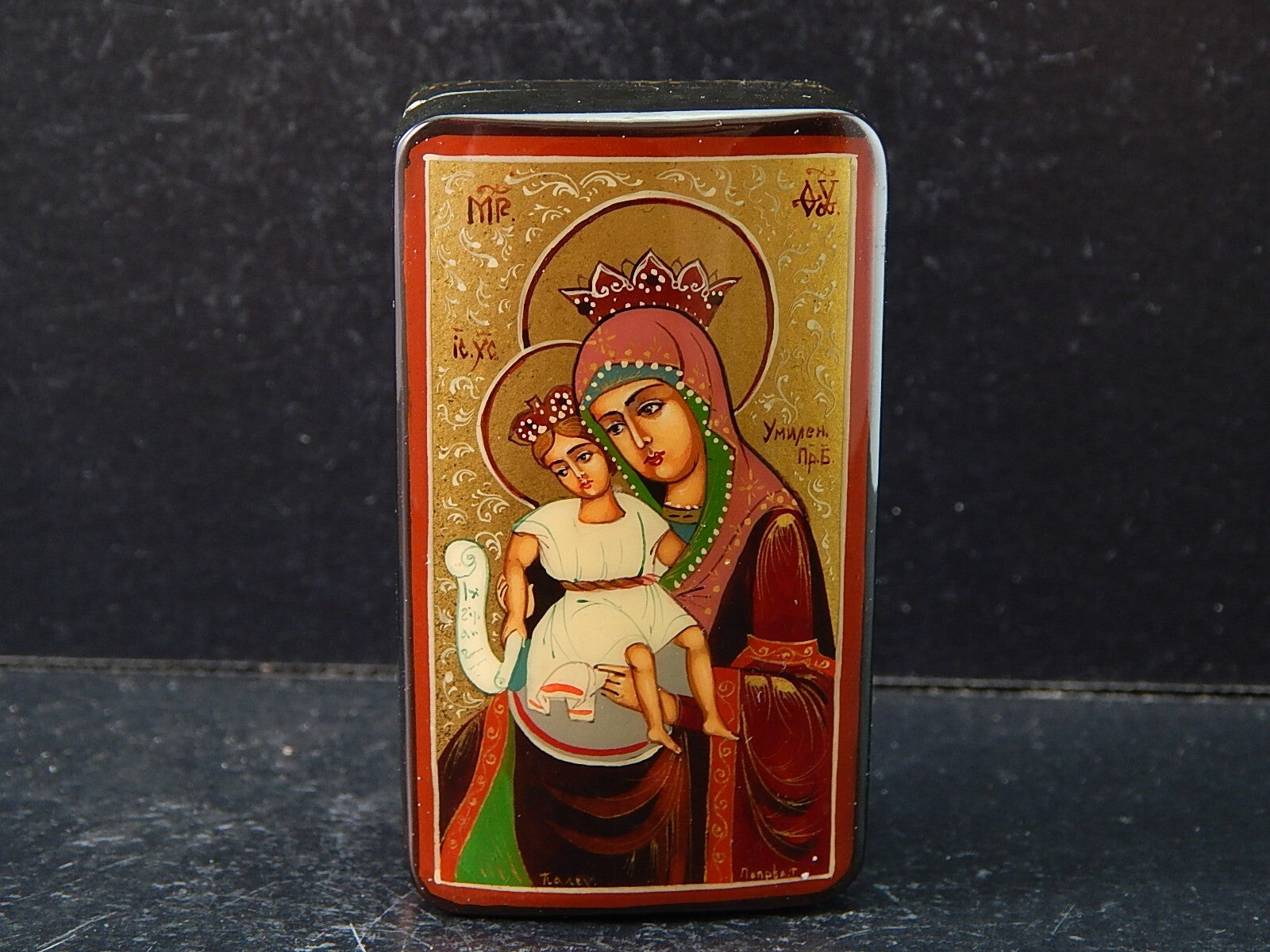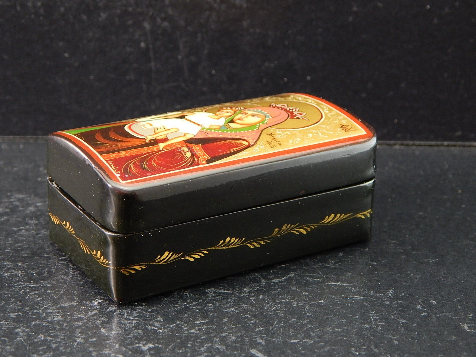 VINTAGE PREZIOSA SCATOLA COFANETTO RUSSO LEGNO LACCATO ICONA DIPINTA E FIRMATA