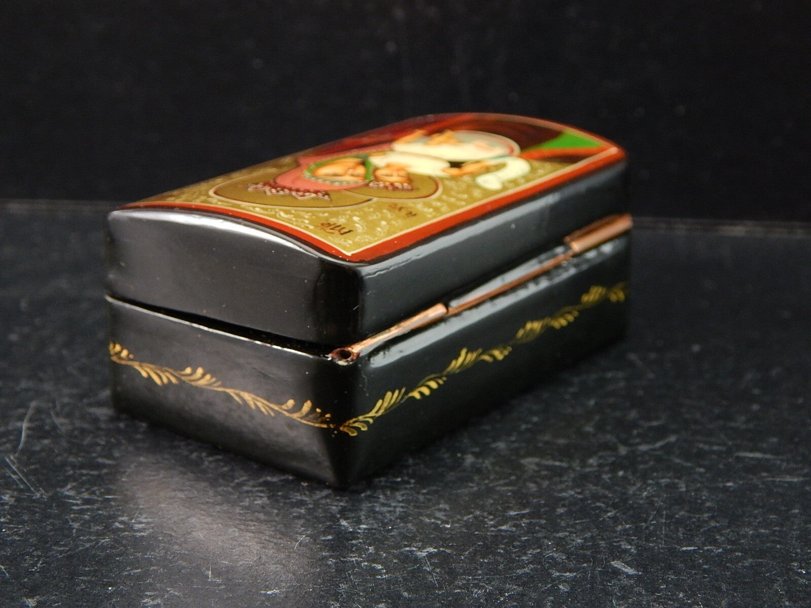 In questa inserzione viene presentata una piccola scatola di legno laccata vintage proveniente dalla Russia, dipinta a mano e firmata