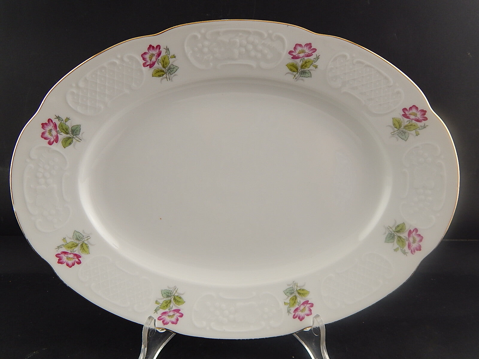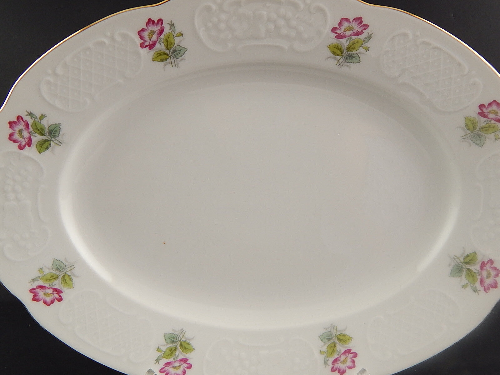 Il piatto in porcellana bianca è decorato con La Rosa canina e misura 31 x 22,5 cm, come si può vedere dalle foto ha una micro scheggiatura sul bordo