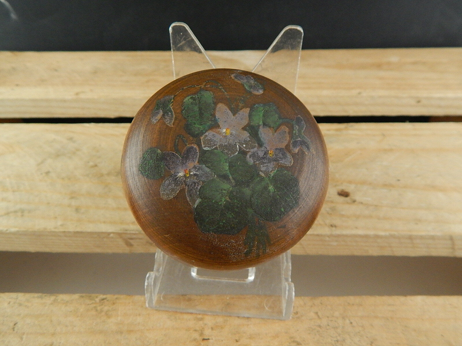 In questa inserzione viene presentata una scatola di legno vintage con violette dipinte a mano che misura 6,5 cm di diametro e 4,5 cm di altezza