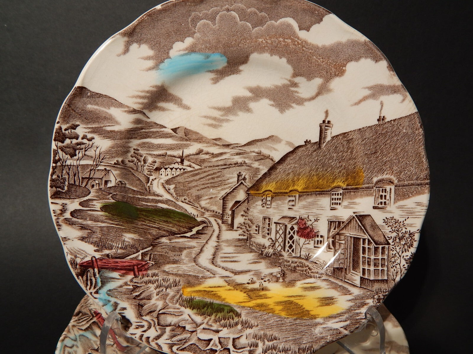 VINTAGE SERVIZIO 6 PIATTI DOLCE CERAMICA W. H. GRINDLEY STAMPA MANO QUIET DAY