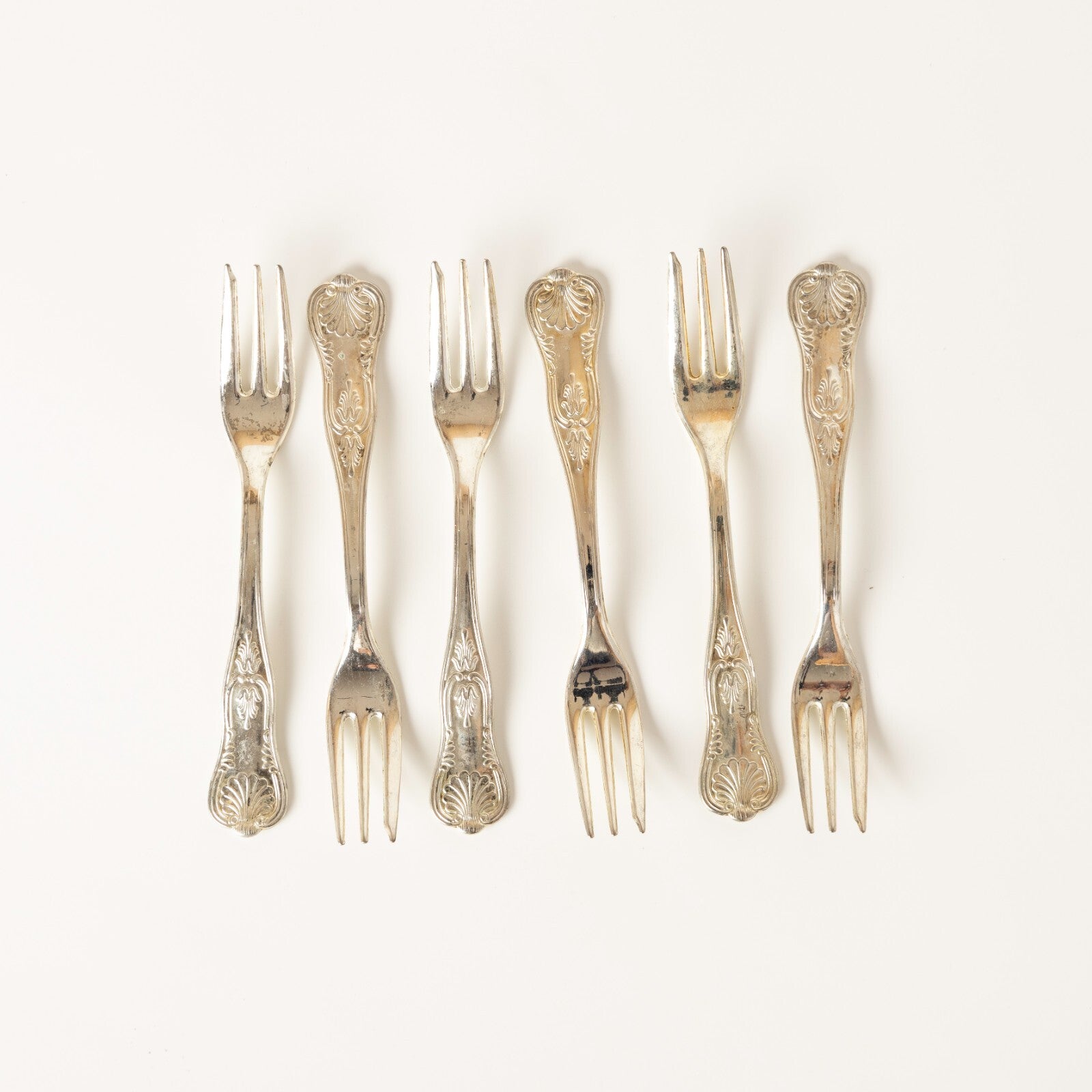 In questa inserzione viene presentato un set composto da 6 forchette da torta vintage argentate in stile Rocaille
