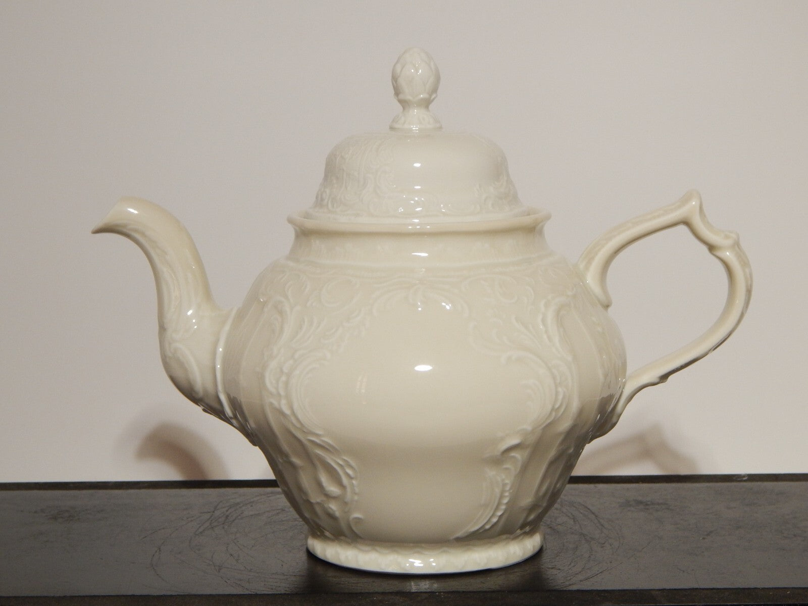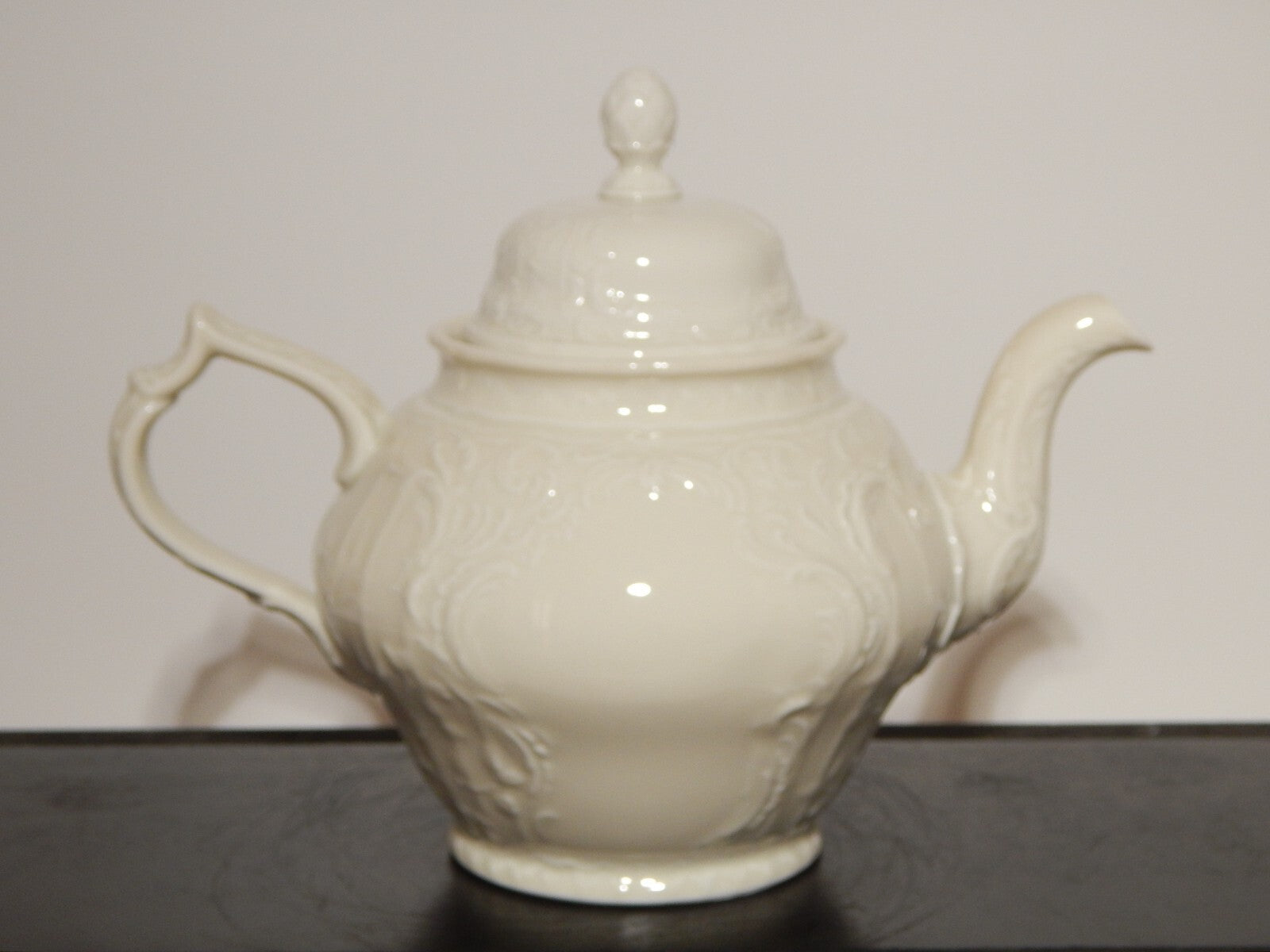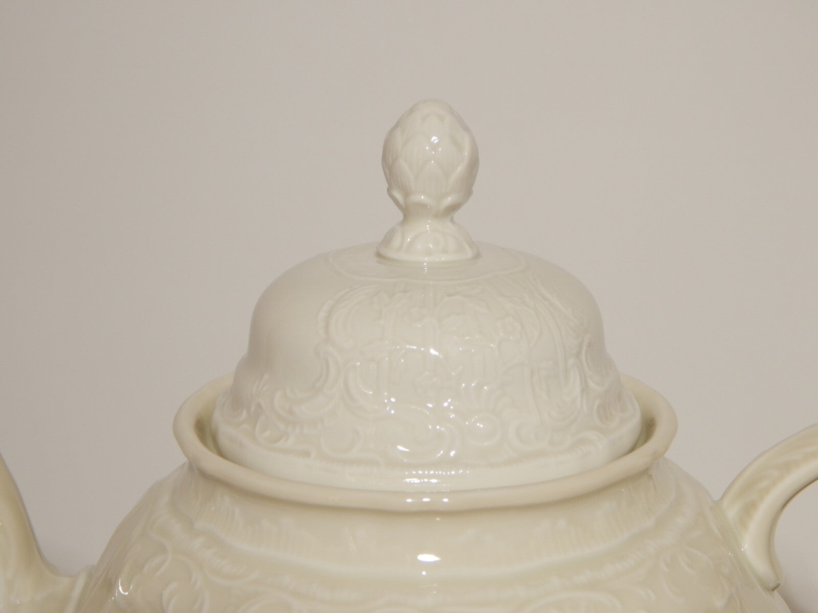 In questa inserzione viene presentata una teiera in porcellana colore avorio modellata in rilievo con il famoso disegno Sans Souci prodotta dalla rinomata manifattura Rosenthal