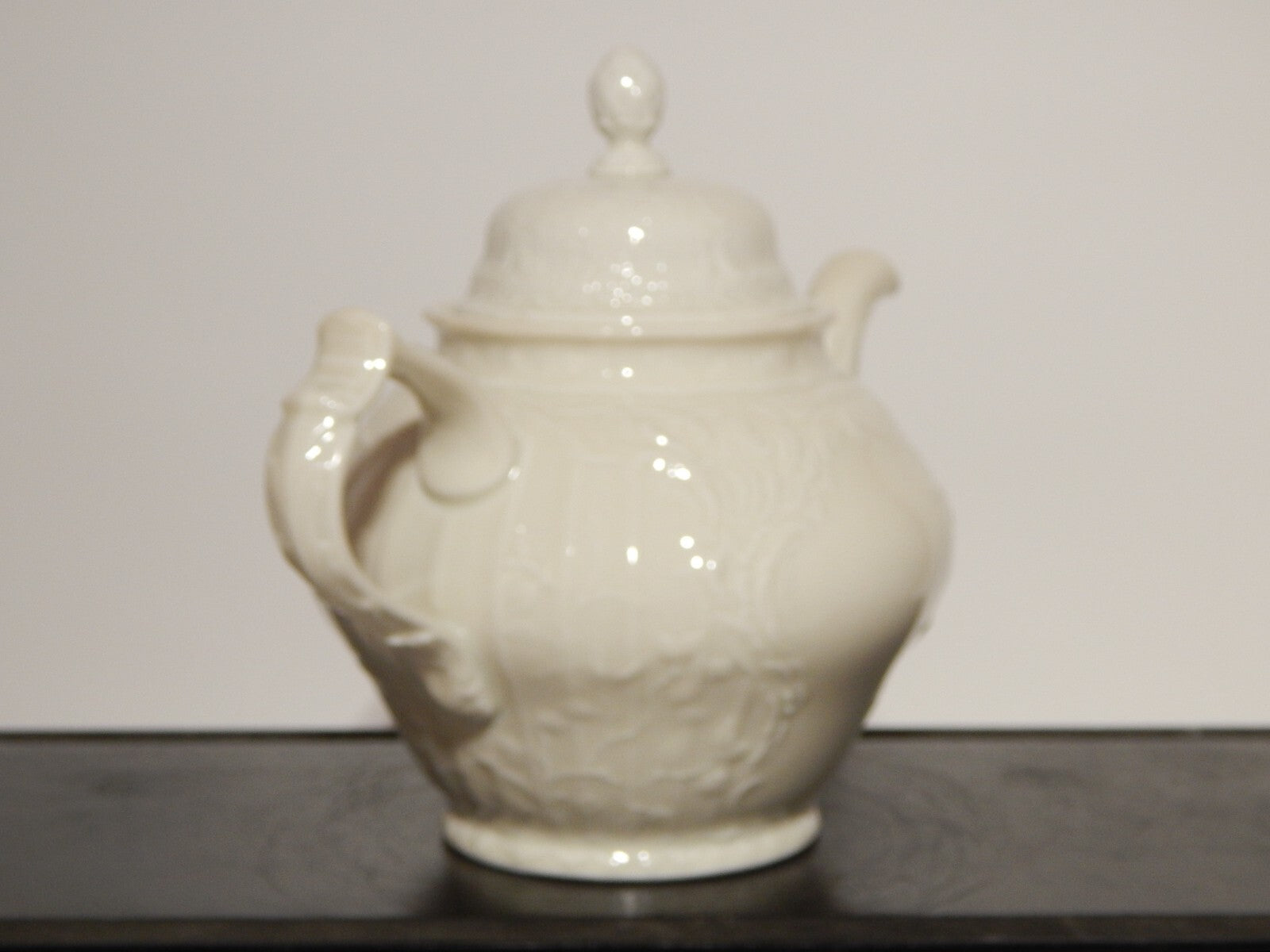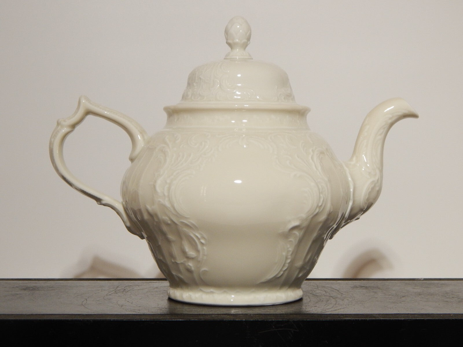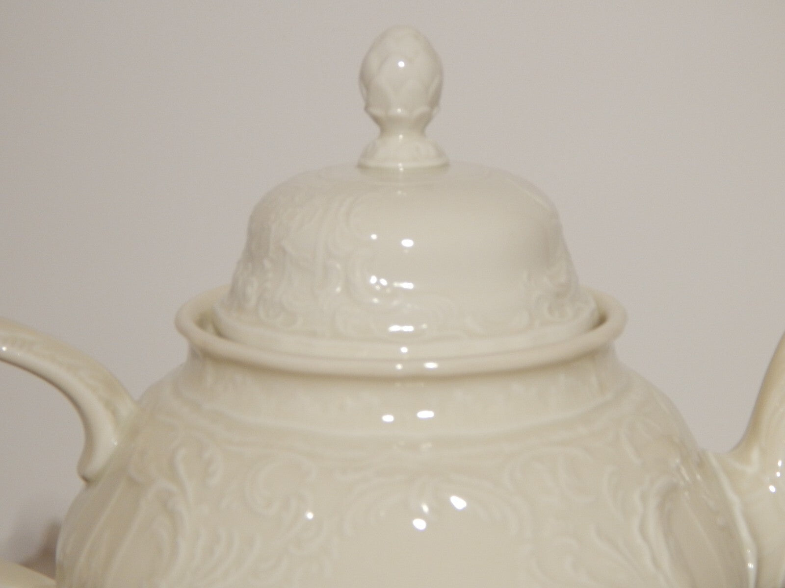 In questa inserzione viene presentata una teiera in porcellana colore avorio modellata in rilievo con il famoso disegno Sans Souci prodotta dalla rinomata manifattura Rosenthal