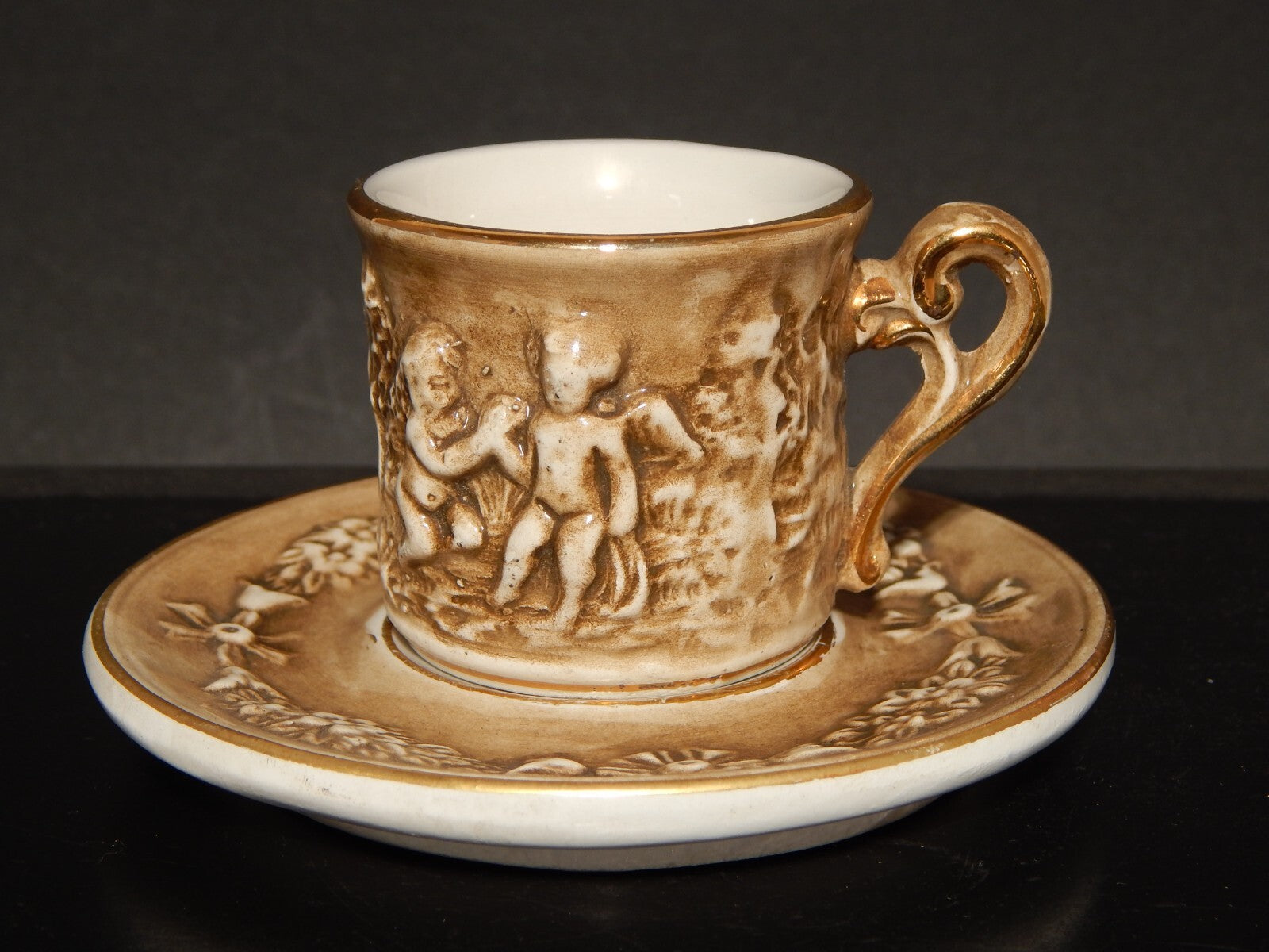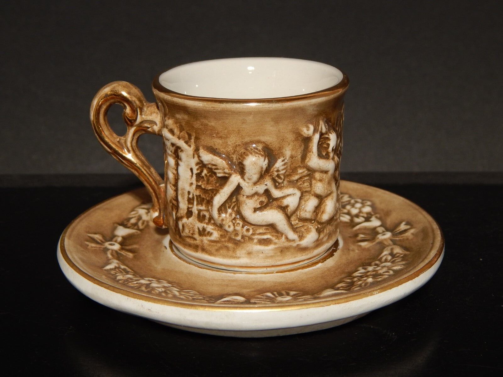 In questa inserzione viene presentata una tazzina in porcellana con relativo piattino realizzata a metà del 1900 dalla manifattura M.A.S. Regio di Capodimonte e decorati a mano in rilievo