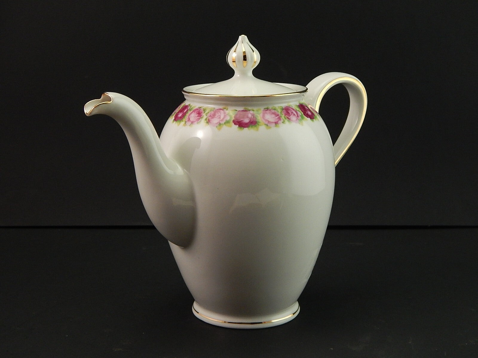 In questa inserzione viene presentata una teiera o caffettiera in porcellana bianca decorata con roselline e rifinita con profili in oro zecchino.