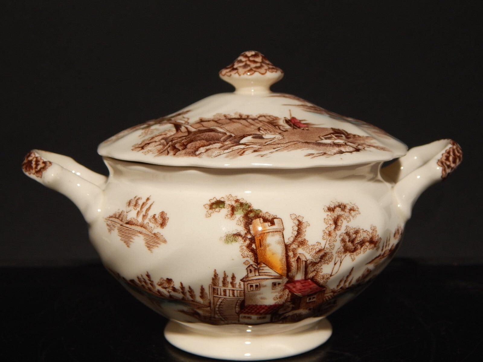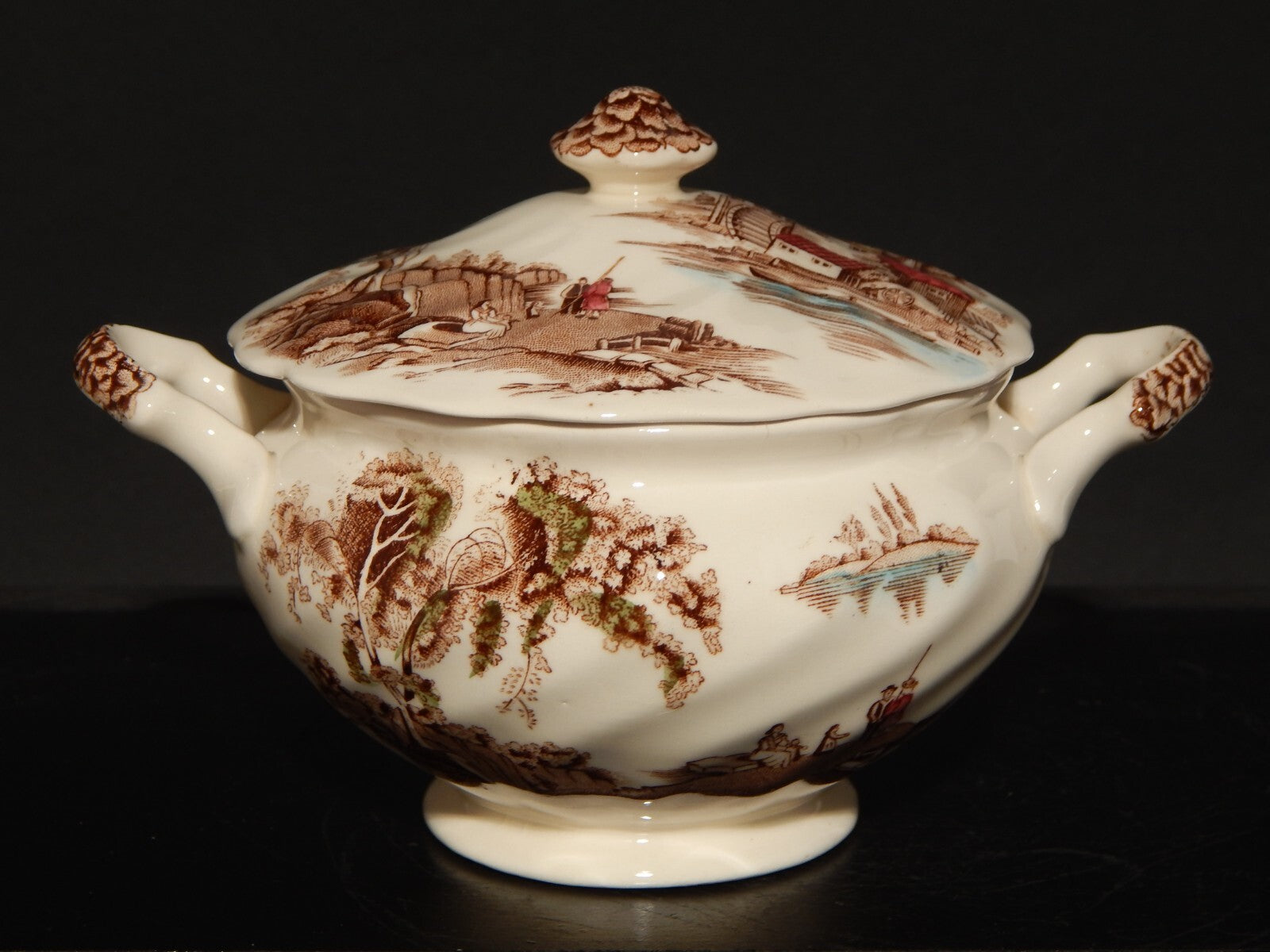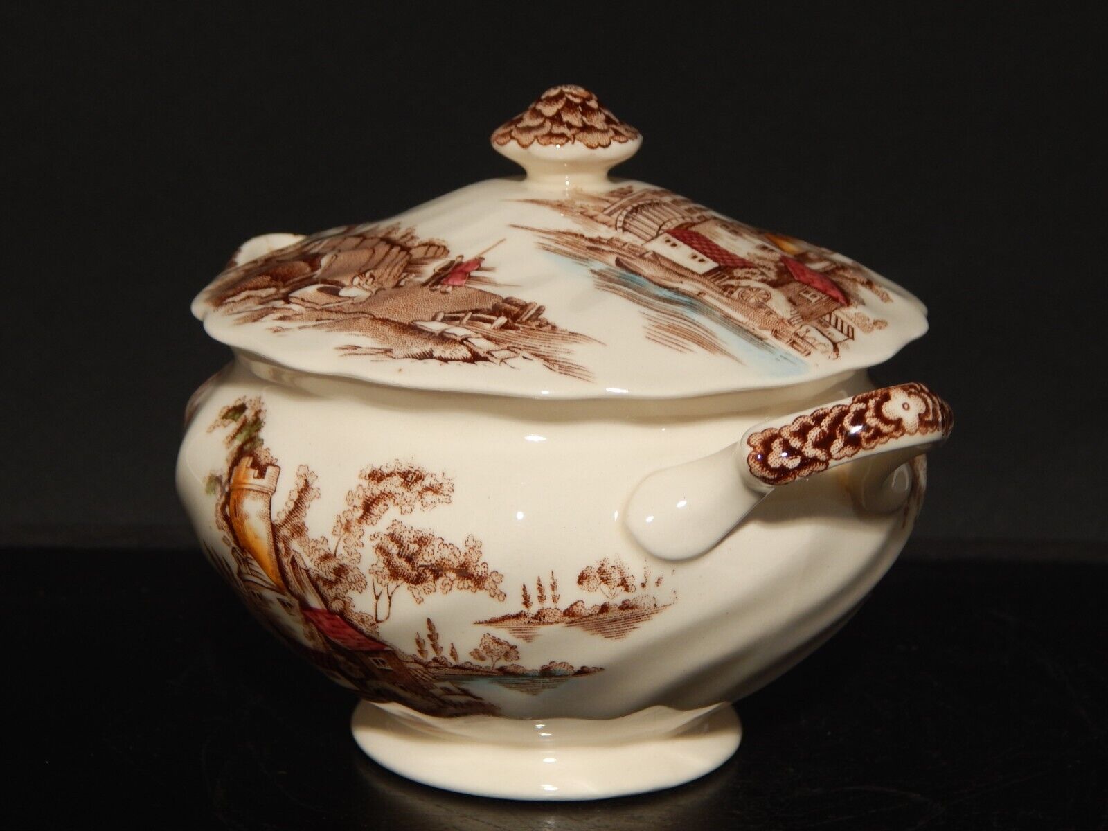 In questa inserzione viene presentata una zuccheriera in semi porcellana inglese della manifattura Johnson Bros nel decoro inciso a mano The Old Mill