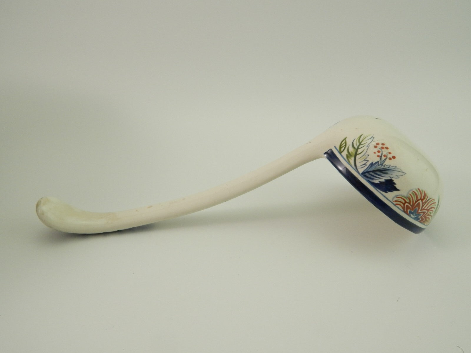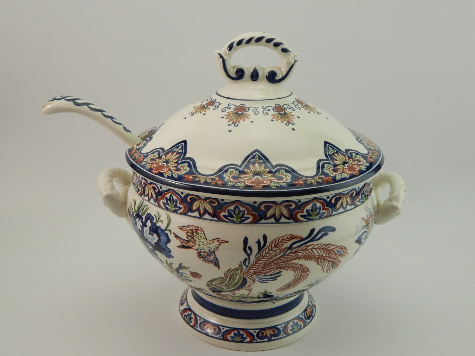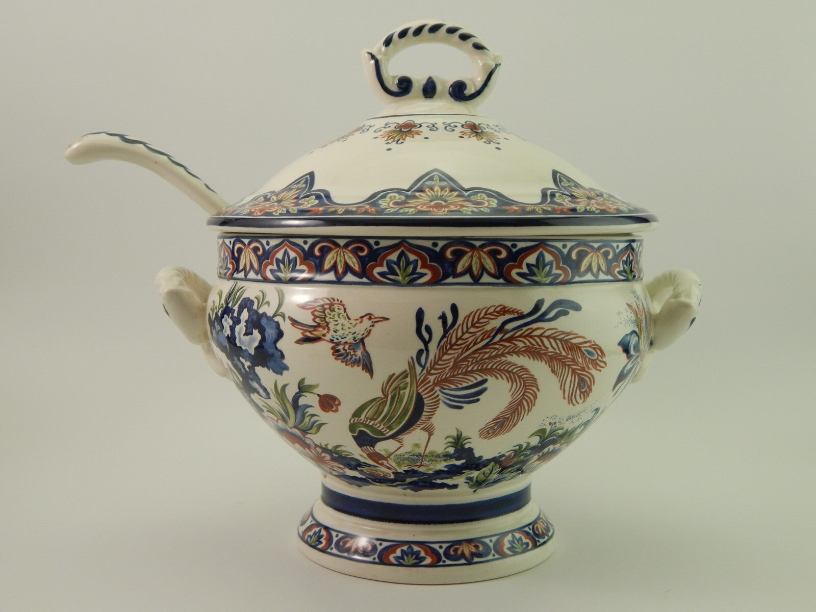 La zuppiera decorata a mano in policromia è in ottime condizioni e misura 23 cm di diametro, 30 cm. da manico a manico e 29 cm. di altezza con il coperchio, il mestolo misura 28 cm di lunghezza
