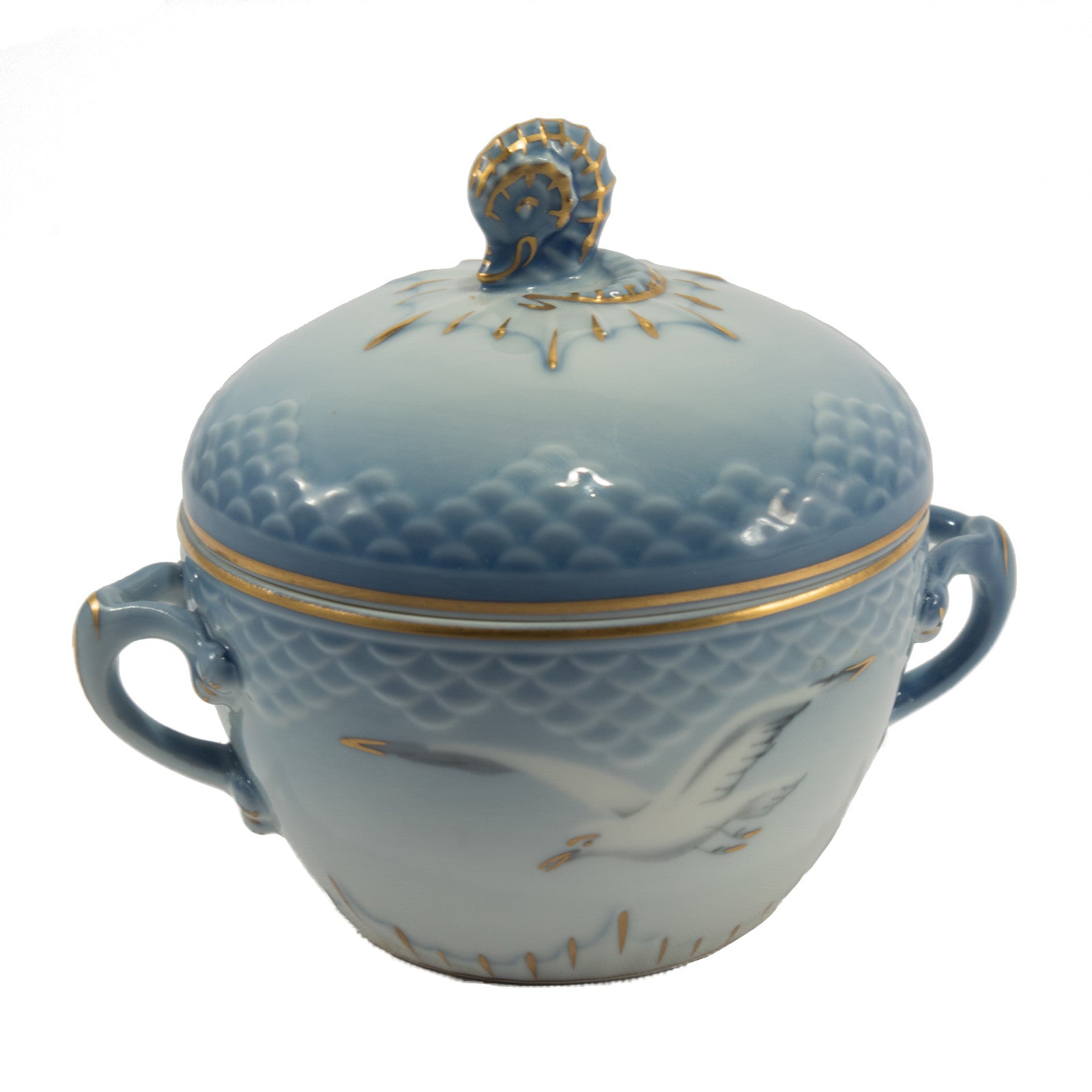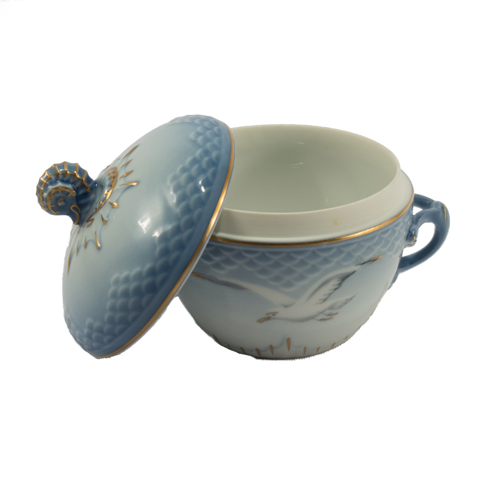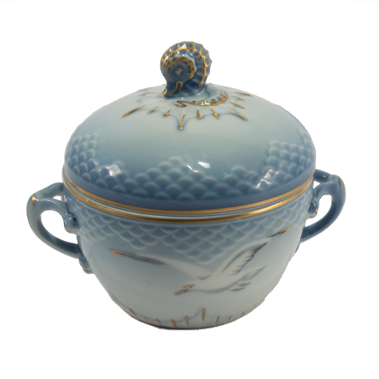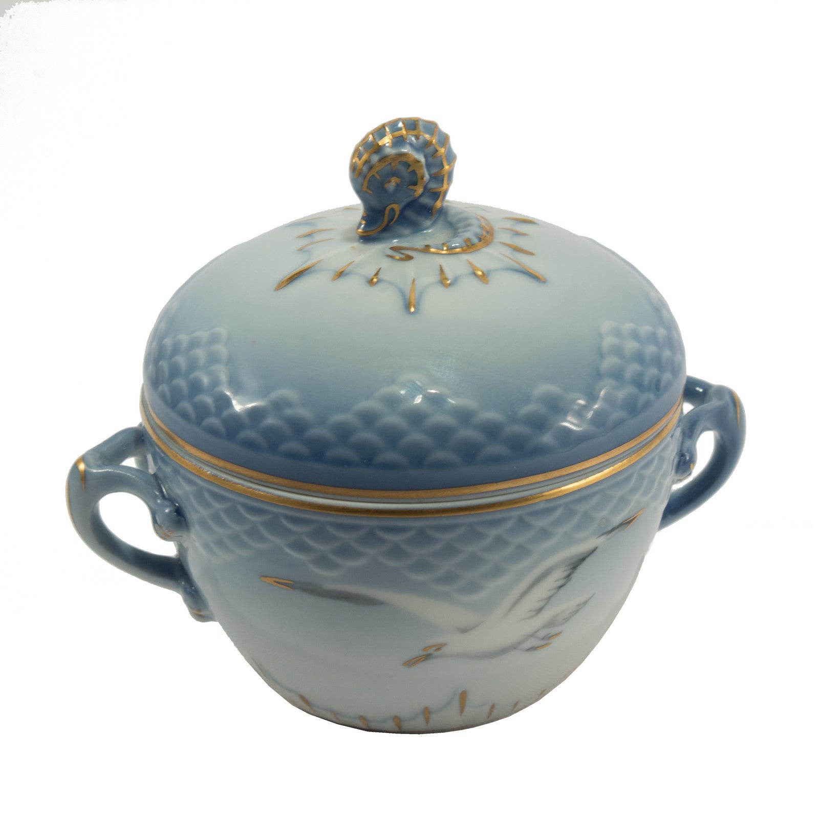 Zuccheriera piccola della famosissima serie “SEAGULL” prodotta dalla manifattura Danese Bing&Grondahl. E' realizzato in finissima porcellana con rifiniture in oro zecchino e il motivo ornamentale è in rilievo decorato a mano nelle classiche sfumature azzurre applicate sottosmalto.
