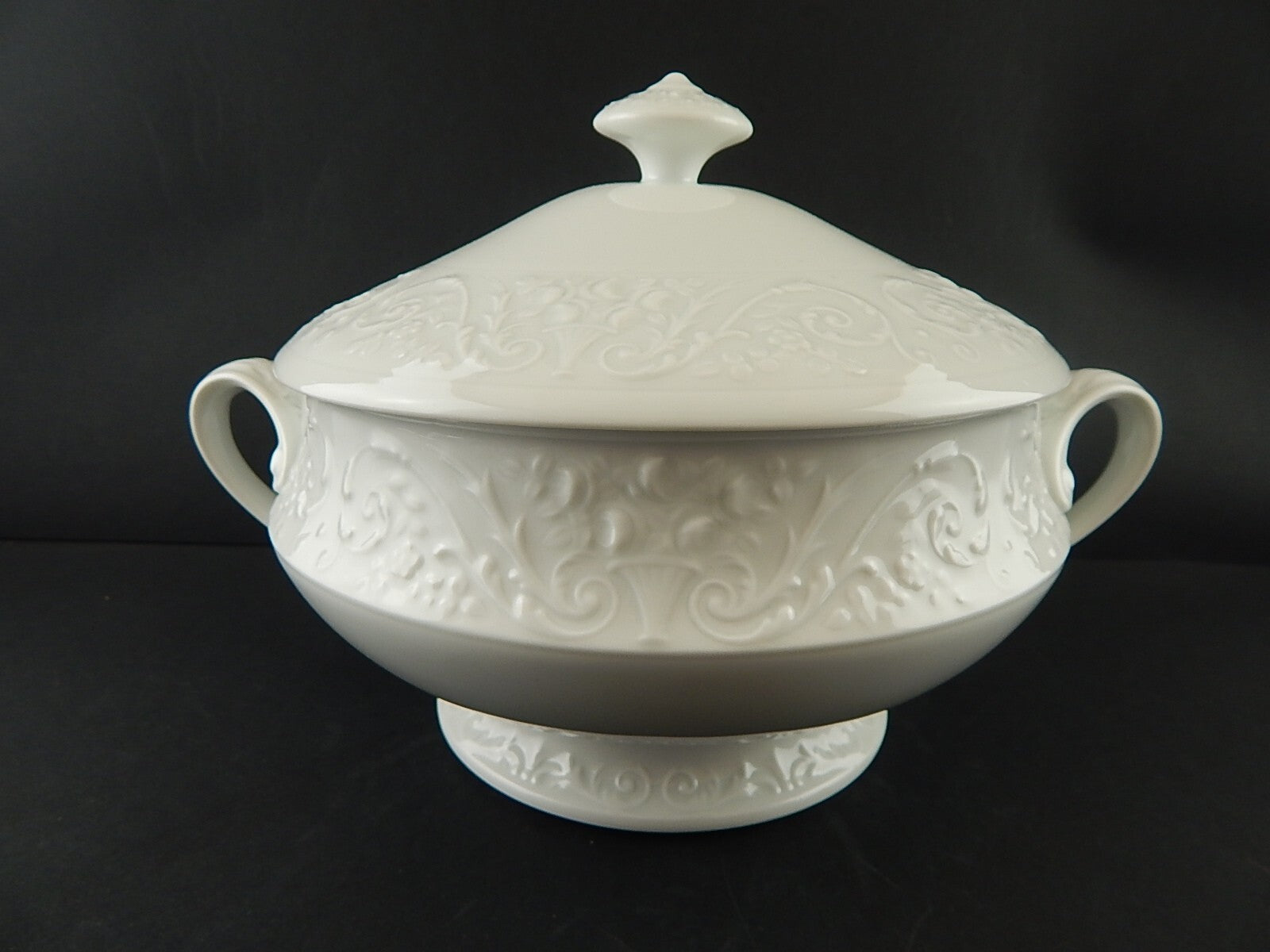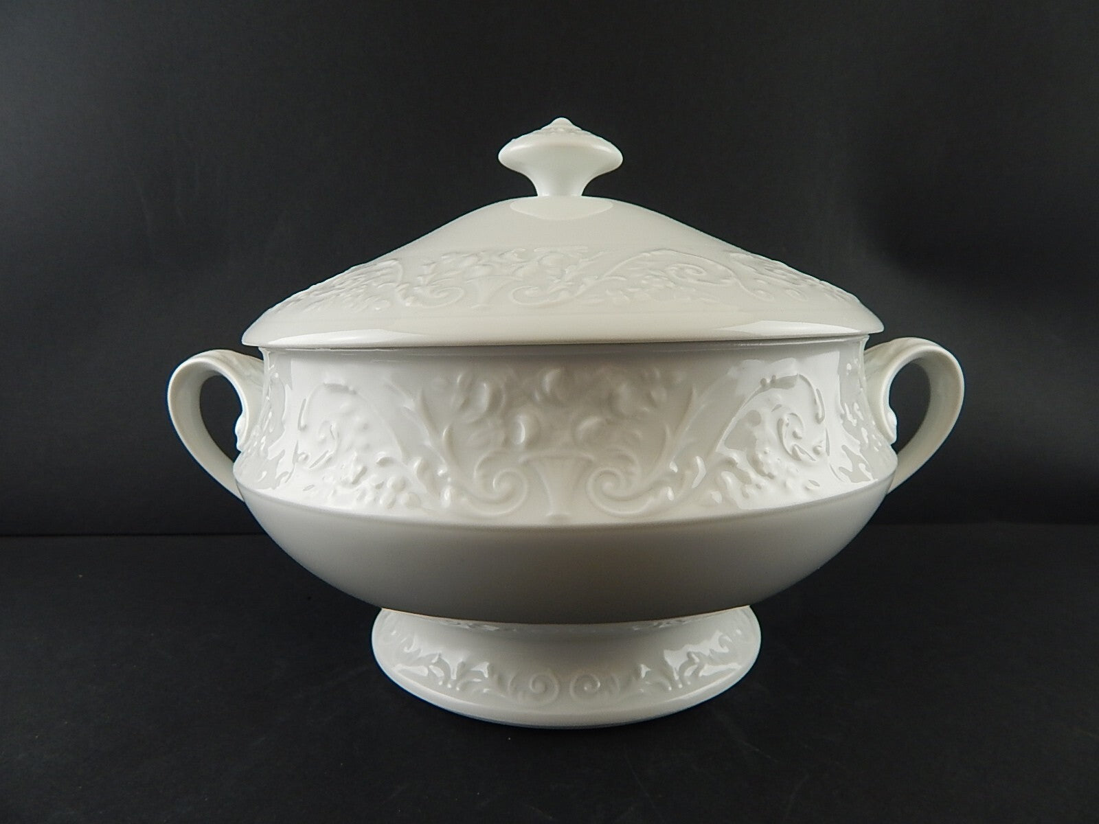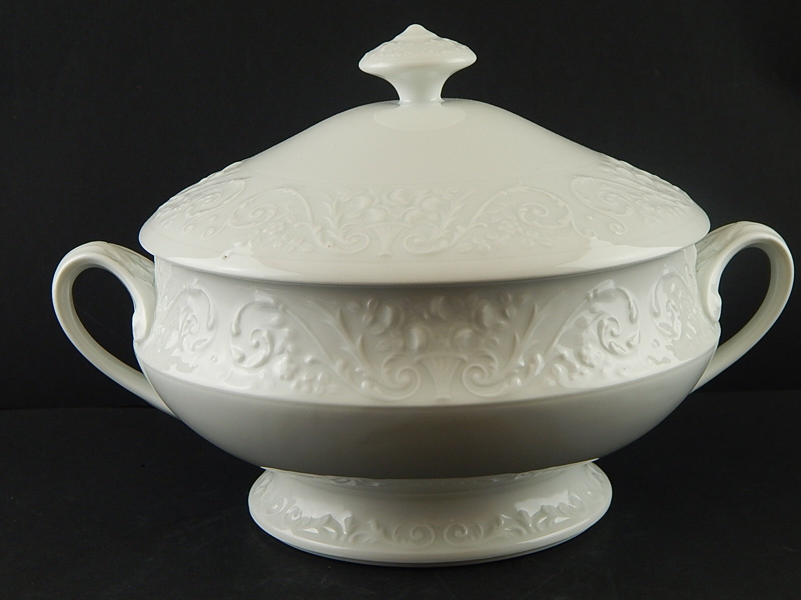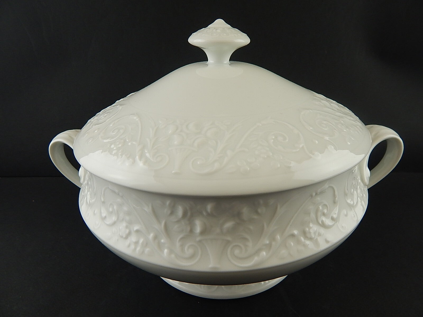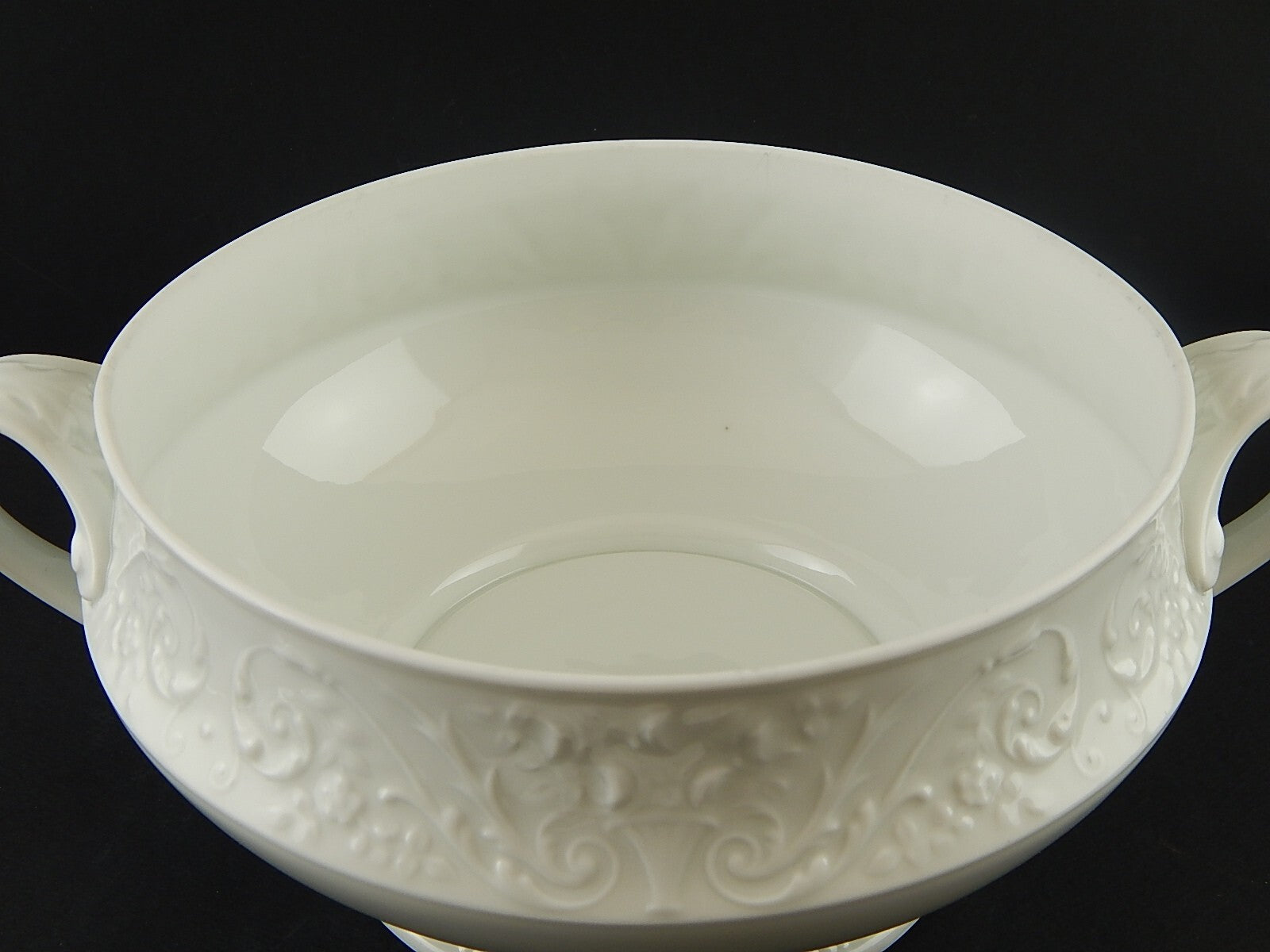 La zuppiera realizzata in porcellana bianca è decorata con motivo ad arabeschi e cornucopia e misura 31 cm di diametro da manico a manico e 20,5 cm di altezza